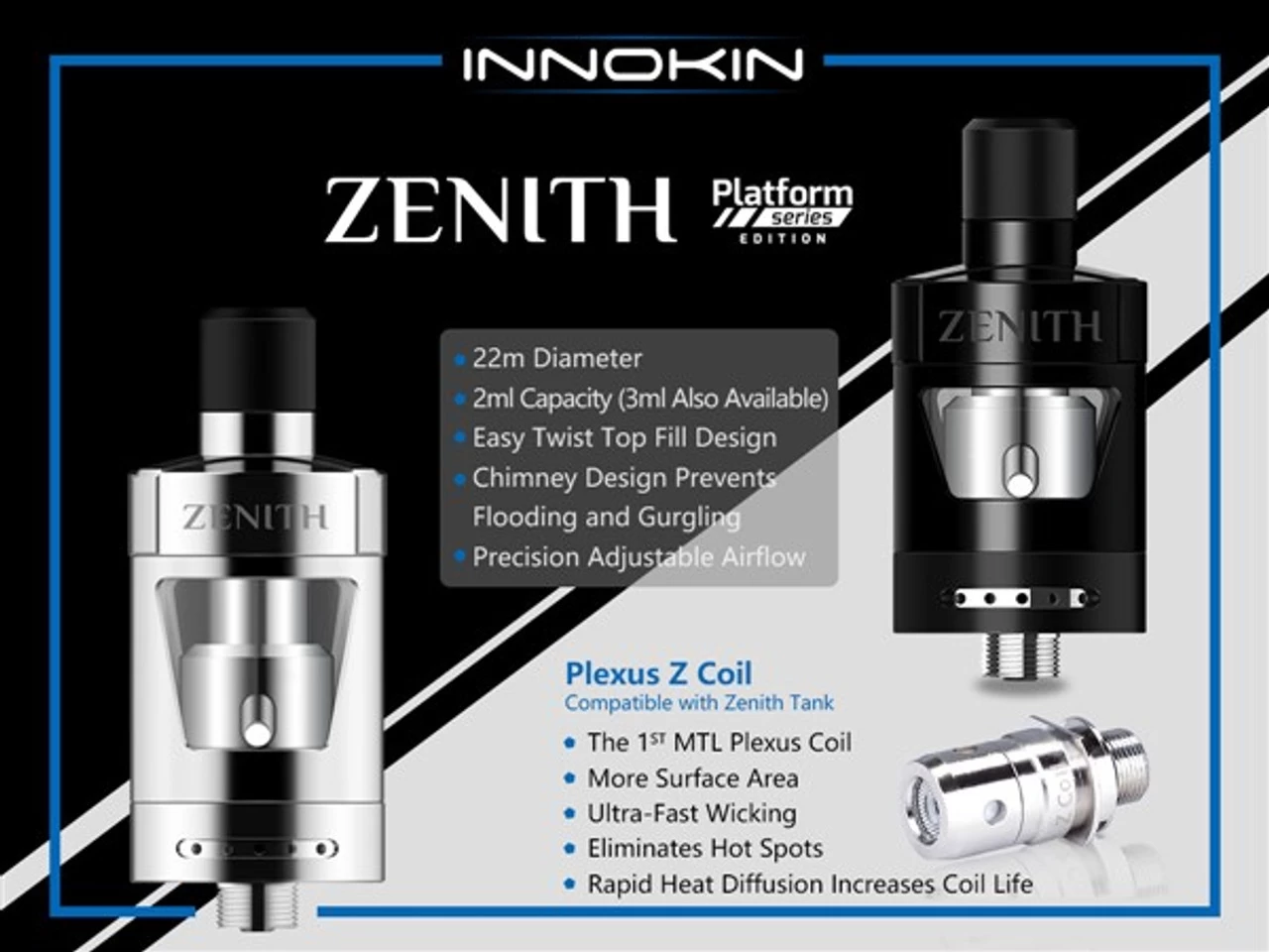 The Zenith D22 tank is part of the Platform Series designed by Phil Busardo, Dimitris Agrafiotis (AKA the Vaping Greek), and Innokin. Their goal was to create an easy and intuitive Mouth-to-lung (MTL) replaceable coil-head atomiser for either the experienced vaper or the new user who wants a no-fuss system.