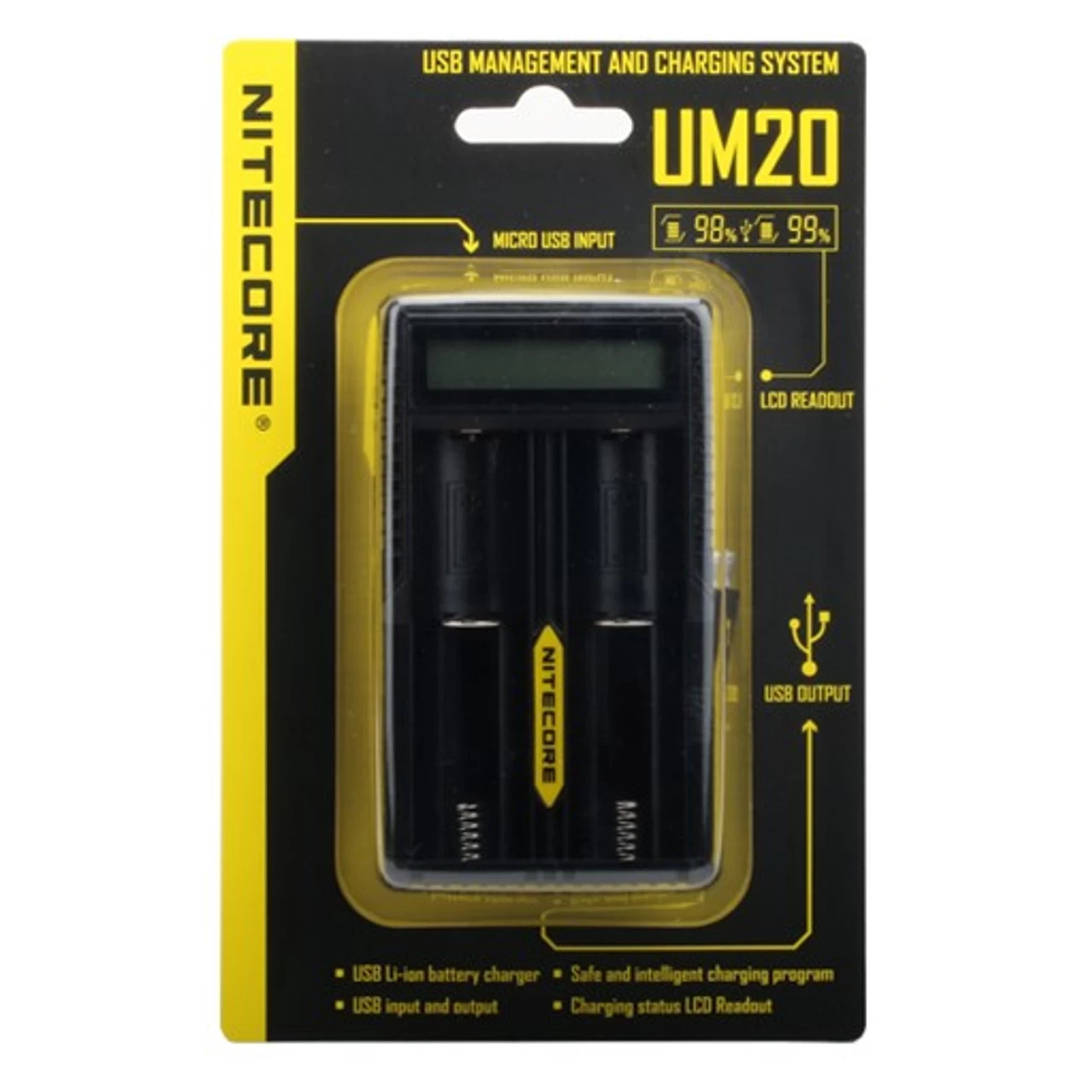 The Nitecore UM20 charger comes with a removeable USB power cable. The charger will automatically adjust charging to match the output power of the mains adapter (not supplied) or other USB power source.