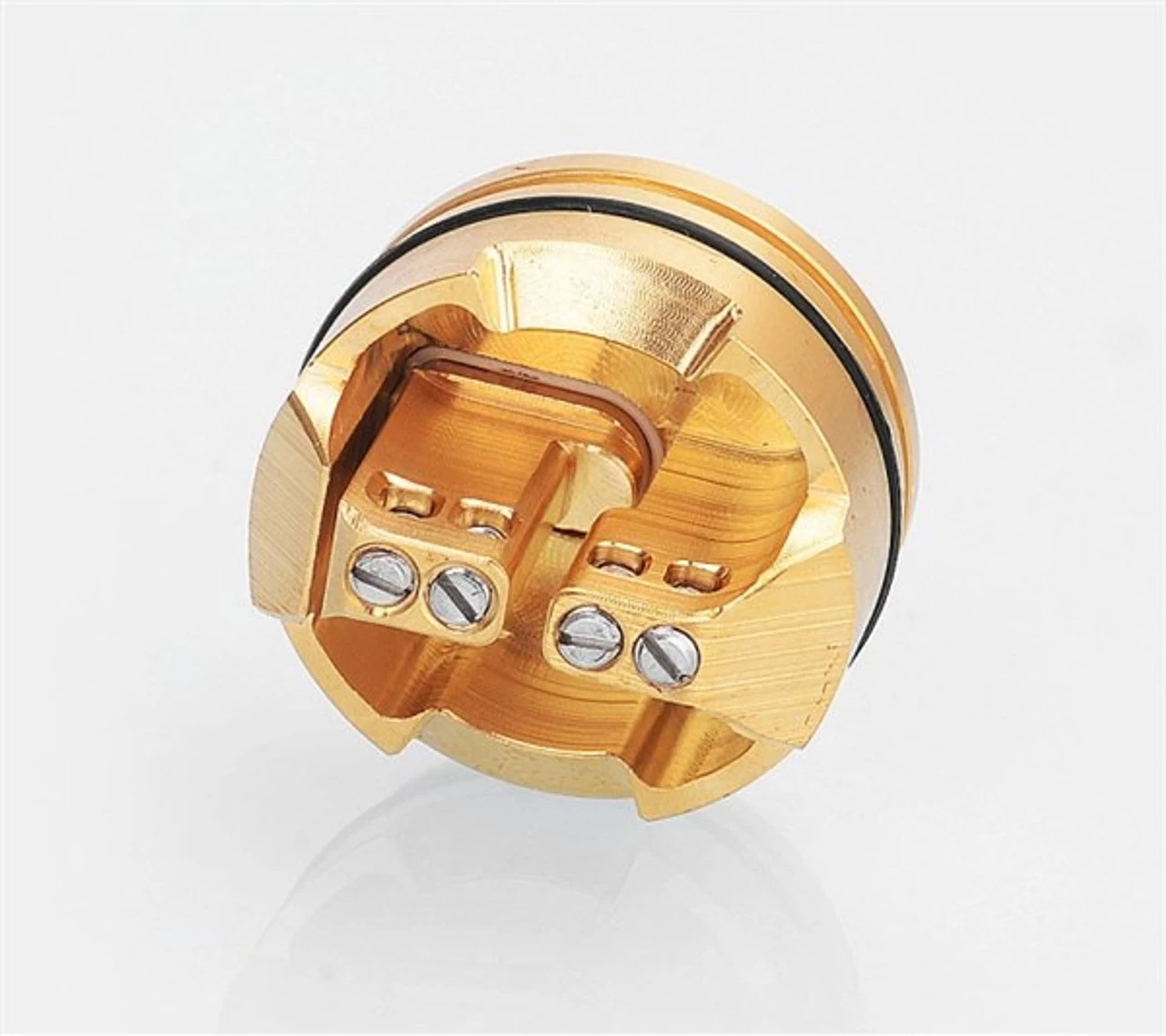 Many experienced DIY coil builders will be very familiar with the layout of the Mushroom Cloud’s gold-plated build deck. The design is incredibly spacious, with two rectangular posts supporting dual coil builds. Each post is drilled with two terminal holes in a side-by-side arrangement. The Mushroom Cloud RDA comes with a handy 3-way tool to tighten up the flat-headed post screws.