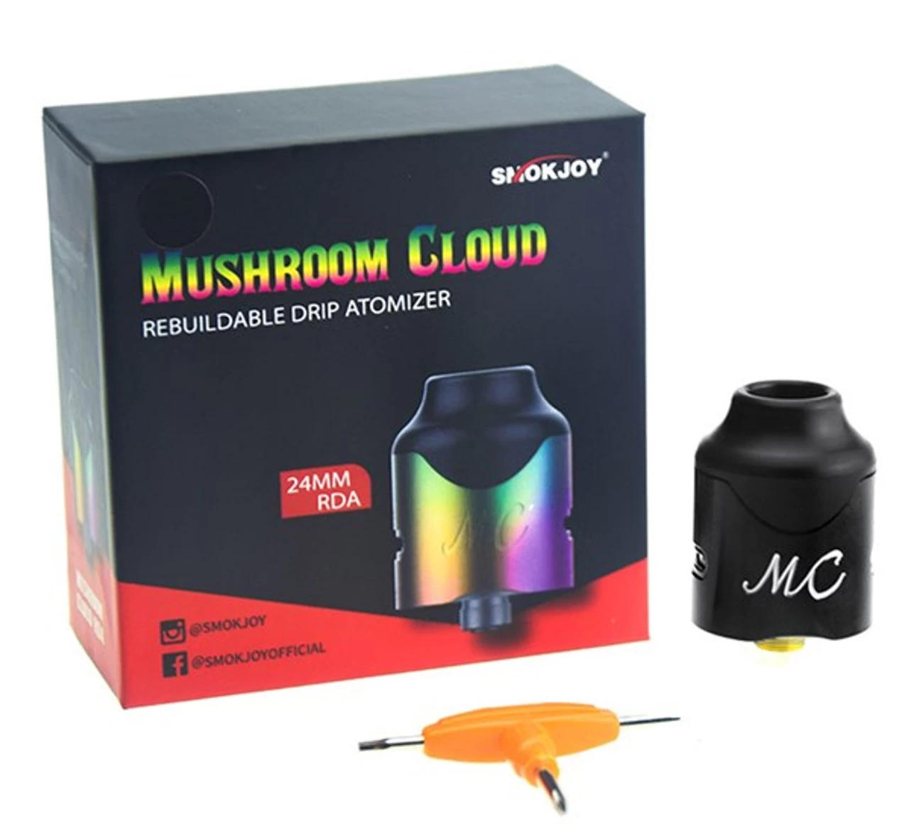 A unique POM drip-tip helps this stylish SmokJoy Mushroom Cloud RDA to stand apart from other drippers. On the outside, the Mushroom Cloud dripper looks smooth and sleek: on the inside there’s a precision engineered dual post build deck with optimised ‘scooped’ airflow. This dual coil RDA needs 24mm of space to fit on a regulated or mechanical mod without overhang.