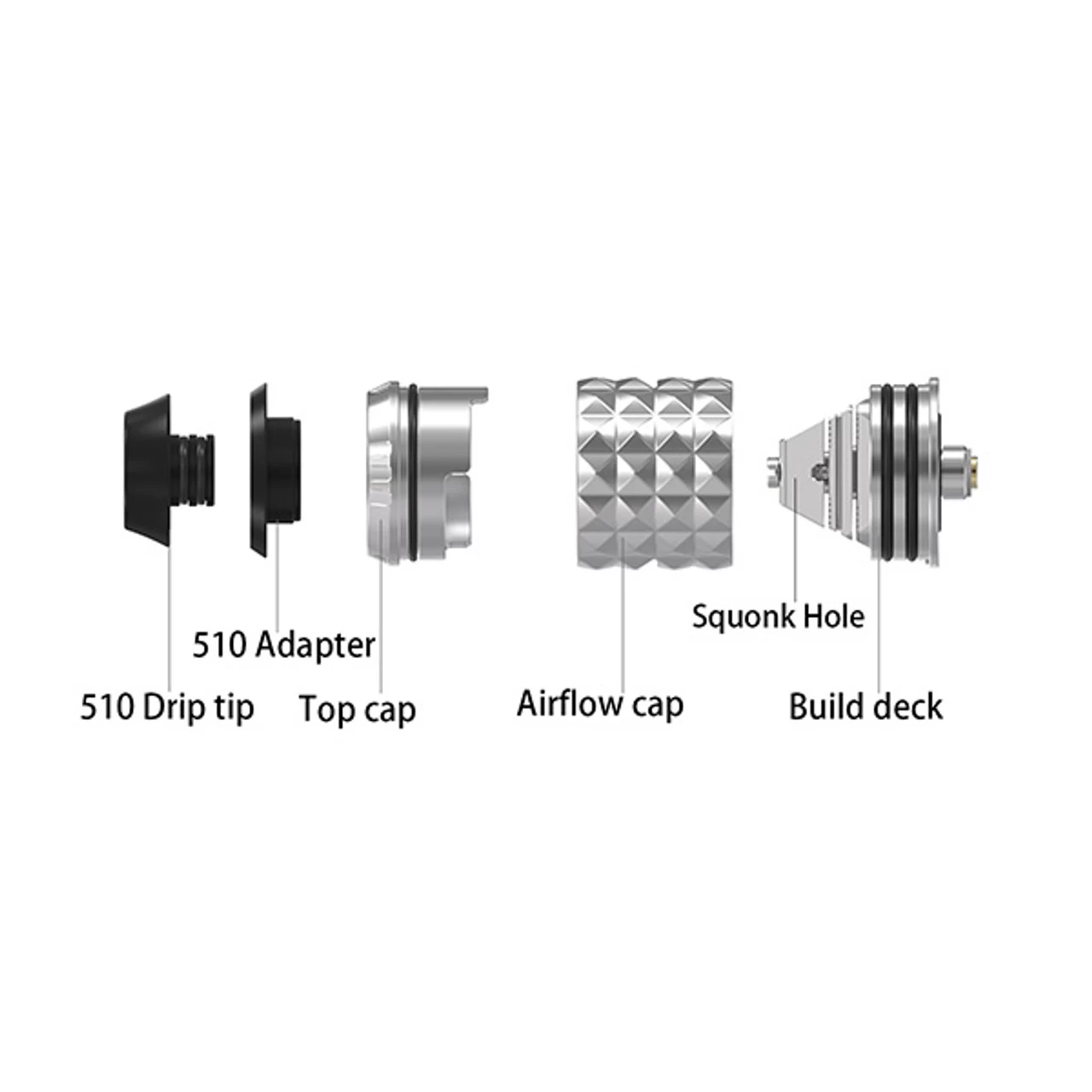 This 24mm diameter RDA is designed to work with most squonk, regulated, and standard mechanical mods. As with all rebuildable devices, you’ll need to understand battery safety, coil wire resistances, power calculations, and take the usual vaping safety precautions before vaping with this RDA.