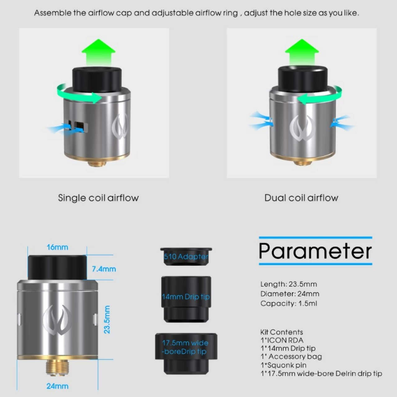 An insulated 510 screw connector and protruding positive pin makes this dripper compatible with hybrid mechanical mods as well as regular box mods. The alternative hollow squonk pin is compatible with many squonk mods. The iCon RDA has a diameter of 24mm. This device is designed for advanced vapers with a detailed understanding of Ohm’s law, battery safety, coil resistances and wire types.